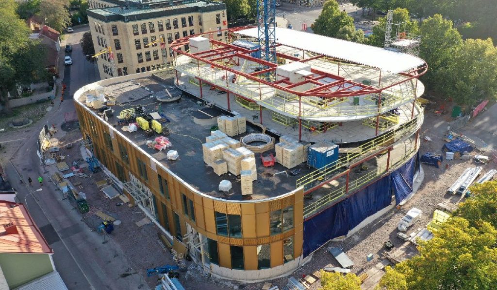 Kulturhusets stomme är klar och byggkranen är nedmonterad. Nu pågår fasadarbeten mot Slottstorget, därefter mot Gavleån och sedan återstår fasaden på den översta våningen. Arbetet löper på enligt planerna. På terrassen pågår takarbeten och om en vecka förflyttar vi oss till den högre delen av terrassen.
